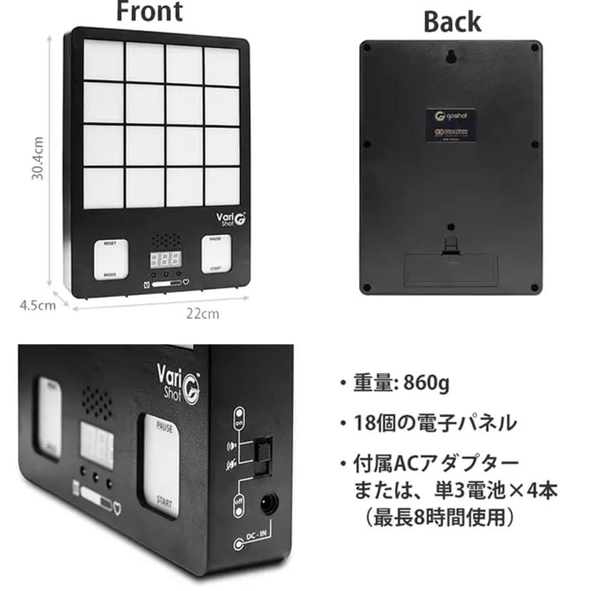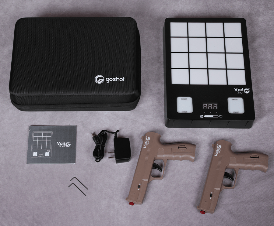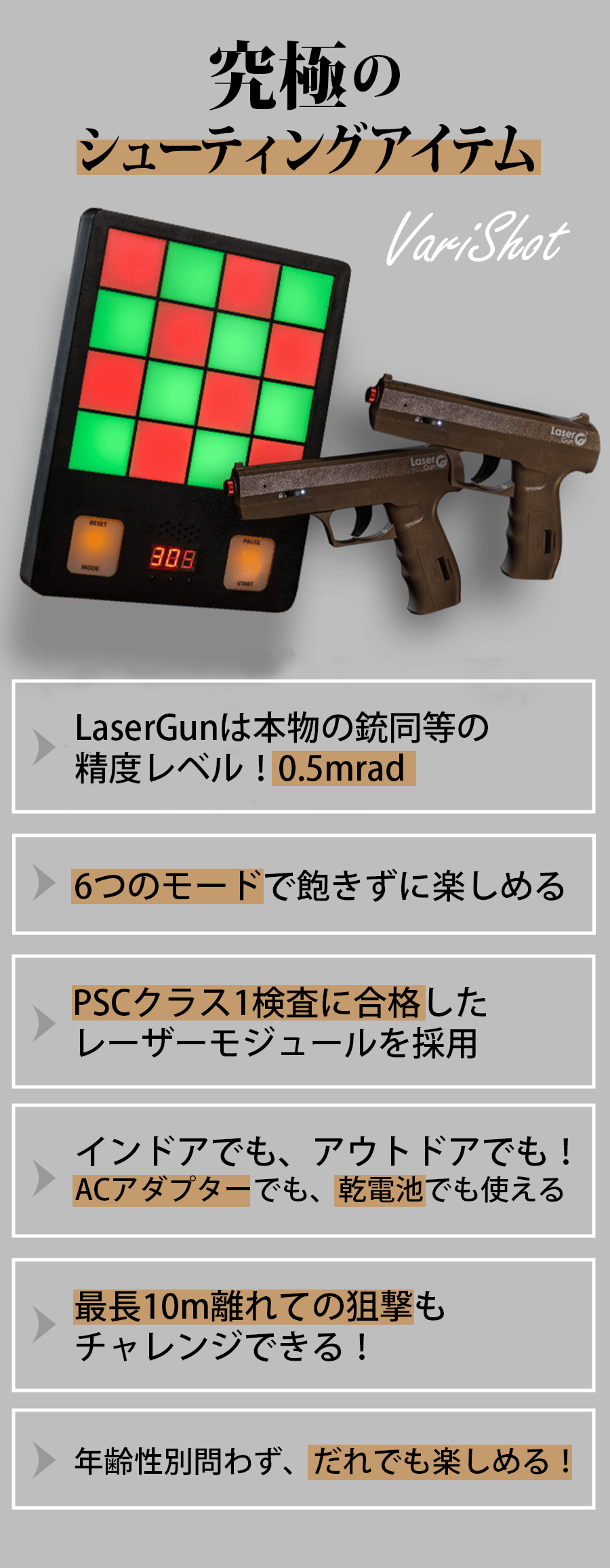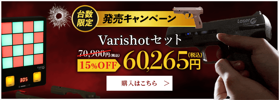 商品構成:VariShot(本体)、LaserGun×2、ACアダプター(12V、1A、ケーブル長150㎝)、照準調整用六角レンチ×2、単4電池×2本(試供品)、取扱説明書、保証書、VariShot専用ケース