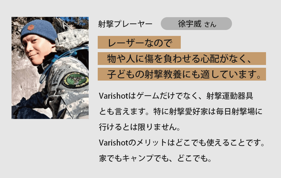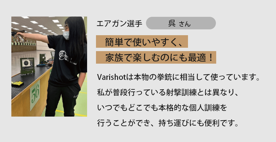設計プロセス中におよそ10000回の発射テストを実施。また、精度、スピード、スタンス/フォームの向上に適応させるため、さまざまな射撃トレーニング方法や競技ルールも熟考しVariShotが生まれました。誇れるクオリティのアイテムです。